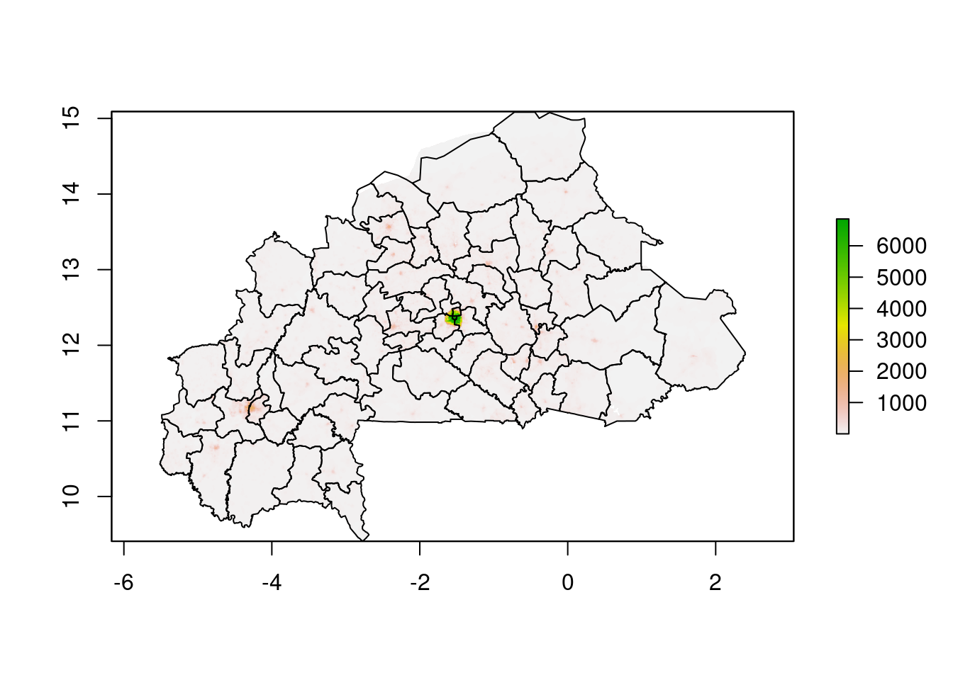 In this page, we demonstrate how to extract values from maps using R. Often we have maps showing values for each pixels, for example, ITN access and usage map with 5km x 5km resolutions or Population counts with 1km x 1km resolutions. To convert these maps to useful estimates for our model, we need to extract the values underlying each pixel in the map, within the geographical area of interest. For example, if the map covers the entire Sub-Saharan Africa, and all we need is values from Burkina Faso, we will need to only extract the pixels within the country’s boundary. Then we would need to aggregate the values of the pixels, to obtain some form of country-wide estimate. Similar analogy is applicable to region, district and province.